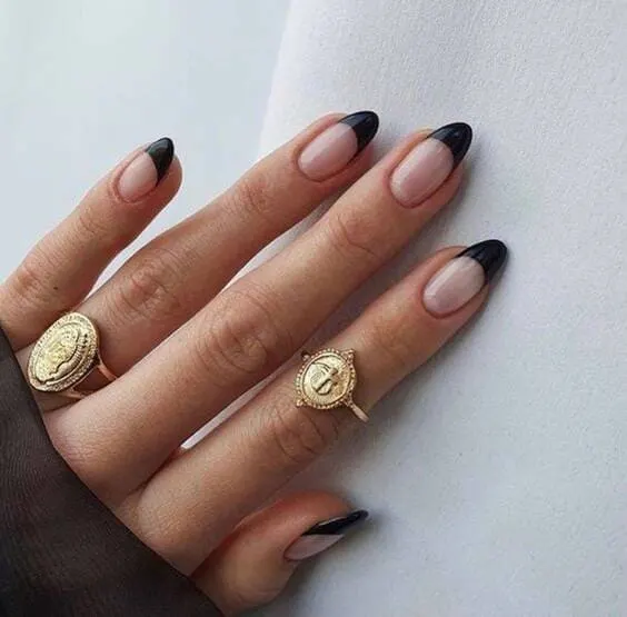 Your classic black tips and sheer gloss polish with round almond-shaped tips.
