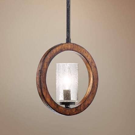 You can also find rustic wood pendant lights that look like they’re from the Old West. Many of these fixtures use a metal chain or chain-like design to suspend the light. They are popular for use in a farmhouse or log cabin-style home. They also complement hardwood floors and other wooden decor very nicely.