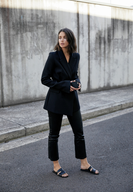 The essence of urban chic is captured in this image, where leather pants form the bedrock of a monochromatically modern outfit. The tailored blazer and relaxed stance evoke an air of calm elegance, perfect for those seeking inspiration for leather-centric attire that speaks to both style and simplicity.