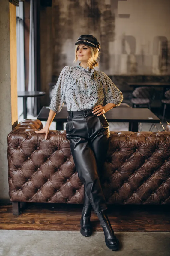 This image presents a bohemian rhapsody, where leather pants are the statement piece amidst soft, floral patterns and the edgy detail of a studded hat. It’s a leather pants outfit idea for the free-spirited soul looking to combine comfort with a dash of avant-garde style.