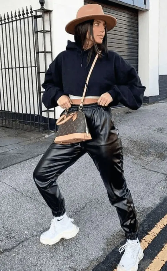 Leather joggers paired with a navy hoodie and trendy sneakers underpin an outfit that screams urban edge with a touch of sporty spice. It’s the go-to uniform for the chic city dweller with a penchant for comfort.
