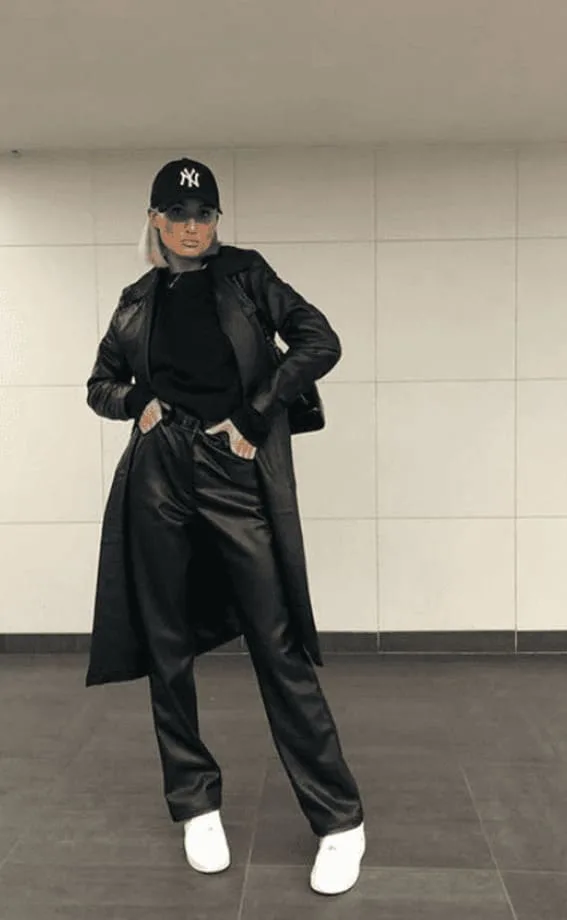 Capture the essence of sporty sophistication with an all-black ensemble, where the classic black leather pants and a casual cap play with the boundaries of high-low fashion. It’s a look that brings athletic vibes to the forefront of street style, whether or not you choose all-white or all-black sneakers.