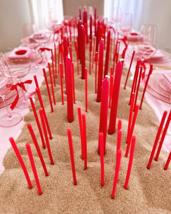 A striking centerpiece of red candles in varying heights rises from a bed of sand, creating a visually stunning, textural contrast.