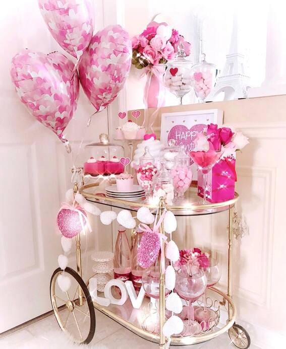 A gold-framed cart is styled with heart balloons, candy-filled jars, fresh roses, and sparkling rosé. Cupcakes and sweet treats sit on top, while the bottom shelf holds champagne glasses and festive décor.