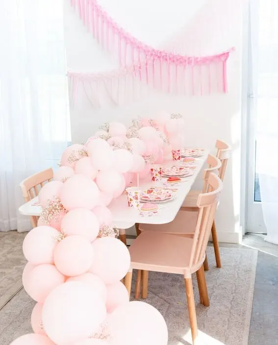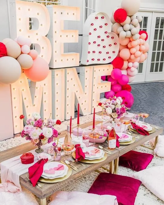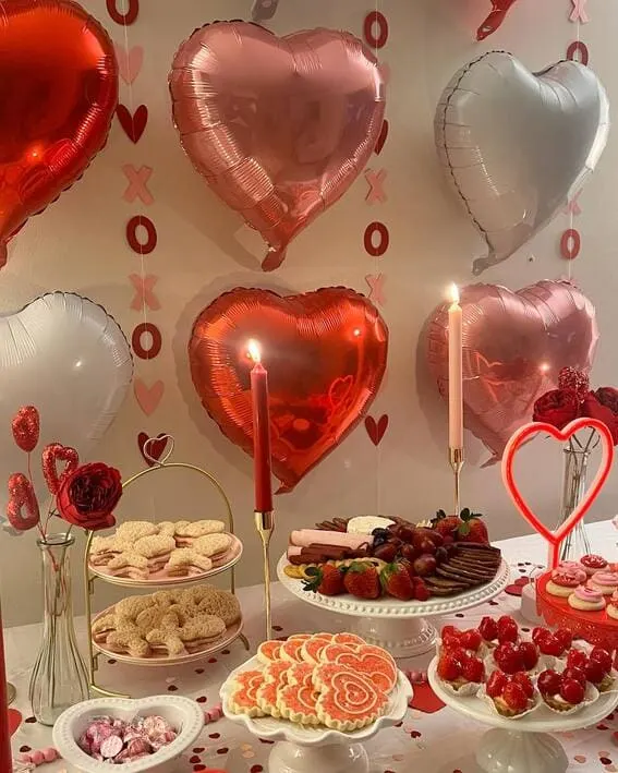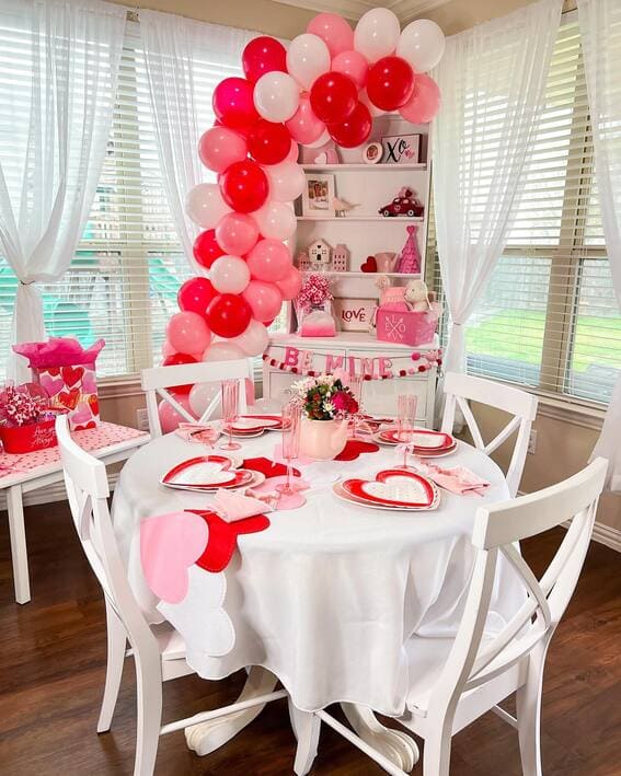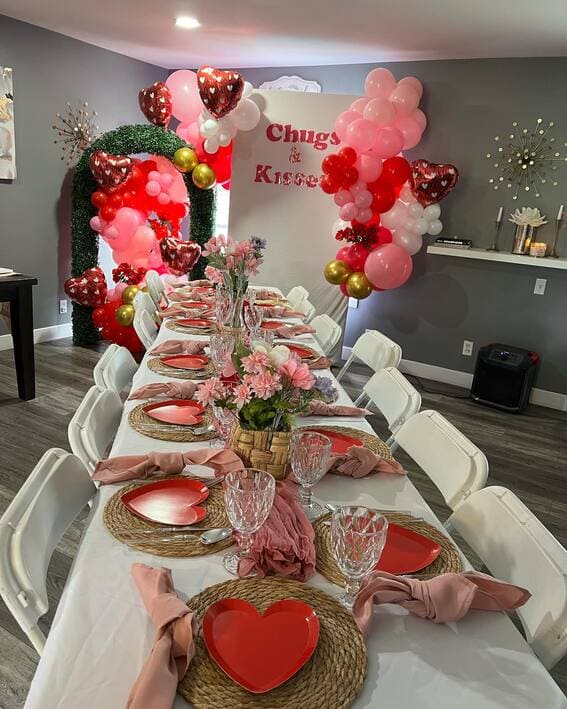 Heart-Shaped Balloon Garland: A playful and whimsical arrangement of pink and red heart-shaped balloons cascading across the table.
