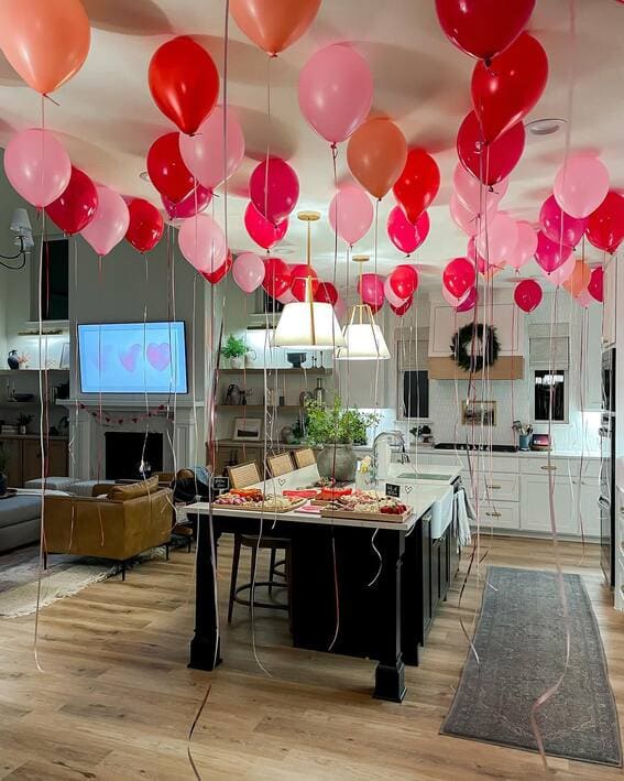 Having balloons scattered all over the room with the hanging strings is such a great idea!