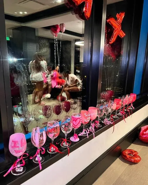Garlands and glittery hearts add a playful touch, making it a dreamy setup for a girls’ night celebration.